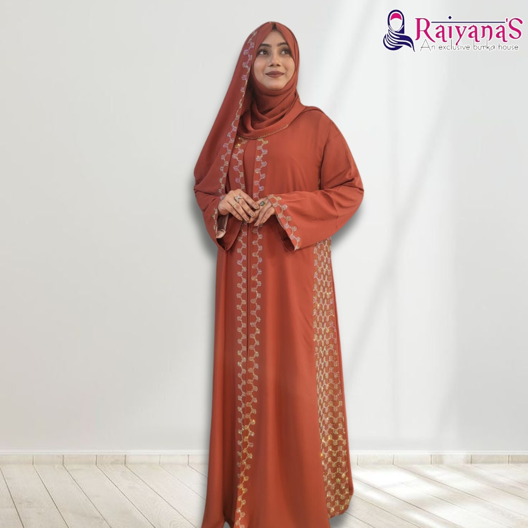 This borka embodies the elegance of a starry night, combining celestial-inspired embroidery and shimmering stones that create a luminous effect. Its lightweight fabric ensures comfort and breathability, making it ideal for festive evenings or prayer gatherings.