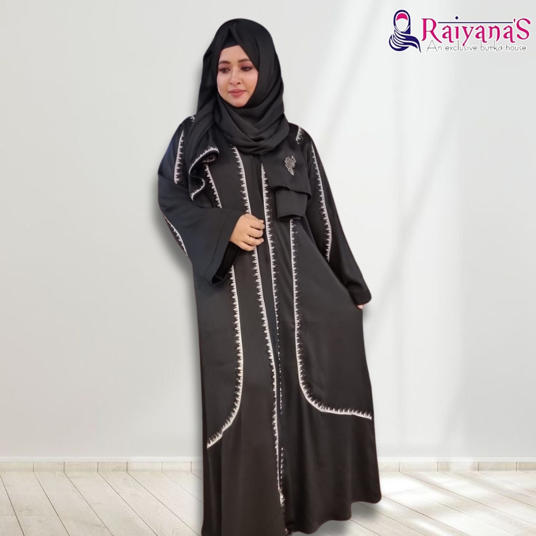 This exquisite borka features gold-tone embroidery with shimmering accents, giving a radiant glow that’s perfect for weddings, receptions, and festive celebrations.