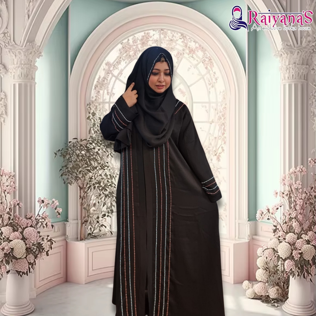 Designed with bold and beautiful karchupi work on a dark, flowing fabric, this abaya reflects the charm of a starry night. The detailed embellishments on the neckline and hem make it perfect for glamorous occasions.